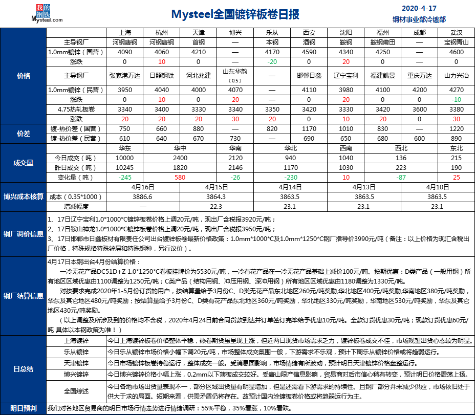 2020年4月17日鍍鋅板卷指數(shù)為85.69與昨日持平。價格方面,截至發(fā)稿,1.0mm鍍鋅板卷平均價格為4285元/噸,較上一個交易日上漲4元/噸。市場方面,博興、沈陽等地區(qū)鍍鋅板卷價格小幅反彈,在唐山限產(chǎn)事件的發(fā)酵下,部分城市經(jīng)銷商情緒面出現(xiàn)一定的改觀,存在看漲情緒。多數(shù)城市經(jīng)銷商考慮到當前市場庫存仍處于同期高位,則是選擇靜觀其變,等待具體減產(chǎn)文件出臺。