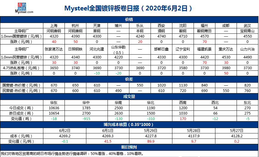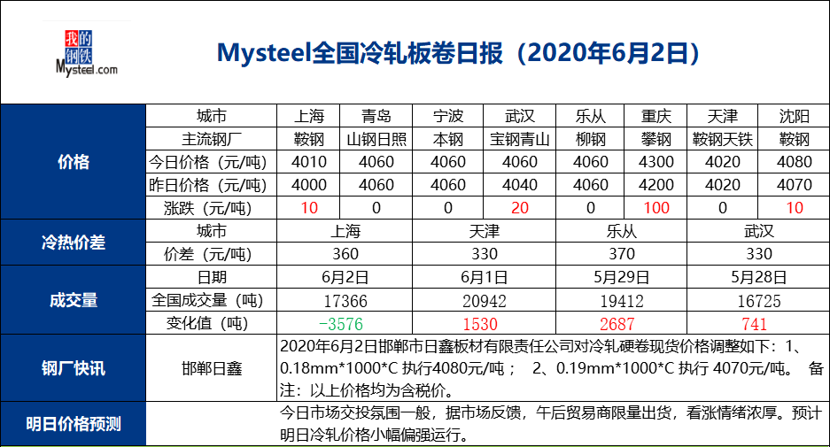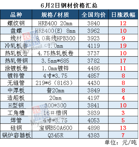 截至6月2日17:00,螺紋鋼(3639, 31.00, 0.86%) HRB400 20mm全國均價3840元/噸,漲12元/噸;線材 8.0高線 HPB300全國均價3923元/噸,漲9元/噸;冷軋板卷 1.0mm 全國均價4119元/噸,漲19元/噸。