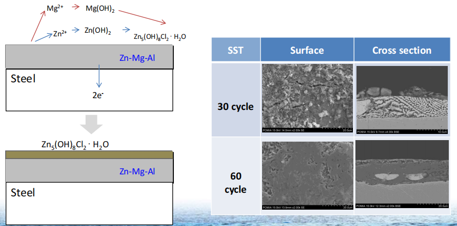 試驗樣品:在同樣實驗條件下純鋅鍍層重量為100g/m2,鋅鋁鎂鋅鋁鎂鍍層重量為70 g/m2 ,鋅鋁鎂鍍層產(chǎn)品表現(xiàn)出更優(yōu)的平面耐腐蝕性能。